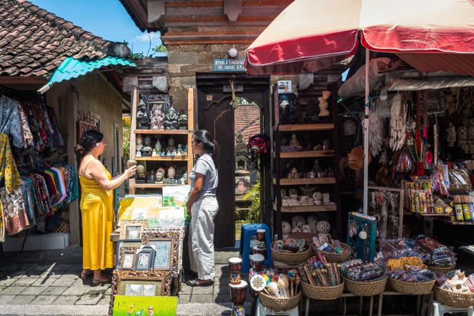 Marché traditionnel d’Ubud : immersion dans l’ambiance locale. Entre les étals colorés de fruits tropicaux, les tissus batik, les objets artisanaux et les souvenirs, c’est l’endroit idéal pour faire quelques emplettes ou simplement observer la vie quotidienne balinaise. :