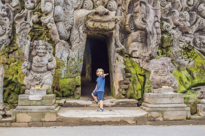 Ensuite, vous poursuivez vers le temple troglodytique de Goa Gajah, aussi appelé la « Grotte de l’Éléphant ». Ce site archéologique fascinant, datant du IXe siècle, est creusé dans la roche et orné de sculptures hindoues et bouddhiques. L’entrée de la grotte, encadrée par une figure démoniaque sculptée dans la pierre, semble tout droit sortie d’un conte ancien. À l’intérieur, vous découvrez des sanctuaires dédiés à Shiva et Ganesha, tandis que les bassins extérieurs, bordés de statues de femmes versant de l’eau, ajoutent à la sérénité du lieu.
