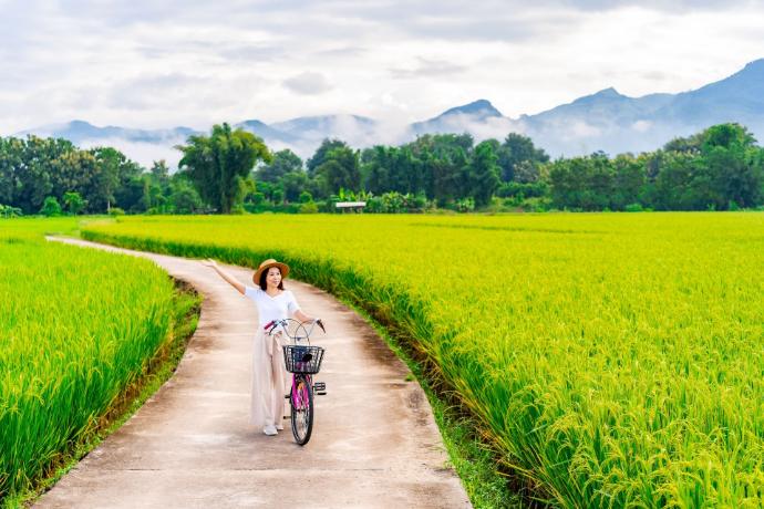 Ensuite, vous enfourchez votre vélo pour une promenade d’environ 2 heures, sur un itinéraire facile (95 % plat ou en descente), traversant des rizières en terrasses verdoyantes, des plantations de cocotiers, des villages traditionnels où les habitants vous saluent avec le sourire, et parfois même des écoles locales, si elles sont ouvertes ce jour-là.
