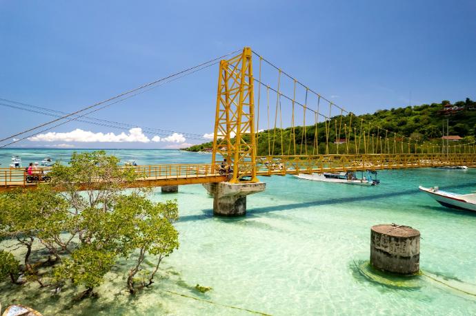 Excursion vers Nusa Ceningan : traversez le célèbre pont suspendu jaune reliant Nusa Lembongan à Nusa Ceningan, et partez à la découverte de cette île voisine, encore plus sauvage. Vous pourrez y explorer des falaises spectaculaires, des piscines naturelles et des plages isolées.