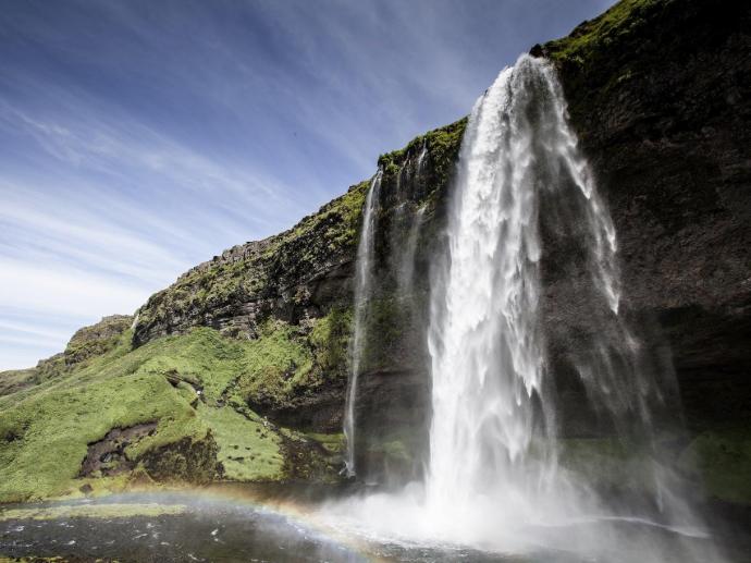 Sous ces calottes glaciaires se trouvent quelques-unes des cascades les plus spectaculaires du pays. Seljalandsfoss est une cascade tout à fait unique. Elle tombe du haut d’une falaise concave, ce qui permet aux visiteurs de faire le tour de son rideau d’eau de source. La cascade Gljúfrabúi est un véritable petit bijou naturel, bien caché derrière de gros rochers. Enfin, la puissante cascade de Skógafoss fait un plongeon de 60 m dans le vide.